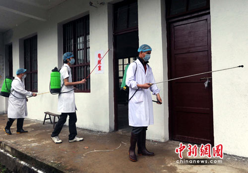 6月24日,福建建阳市将口镇卫生院医务人员在相关专家指导下在设立于该镇芹口村的一灾民安置点区域进行防疫消毒,以确保“大灾之后无大疫”。 作 者:刘可耕