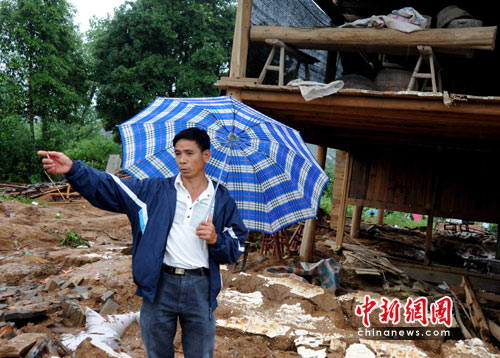 6月24日,福建建阳市将口镇横塘村固县自然村村民杨美良在被毁房屋前向记者讲述,6月20日他与另一村民用竹排救出20多位被洪水围困村民惊心动魄的经过。作 者:刘可耕