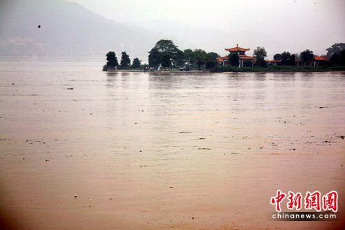 图为被洪水包围的长沙橘洲公园。中新社发 白祖偕 摄