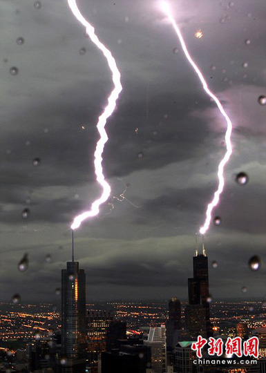6月23日晚,美国芝加哥的一位摄影师在雷雨拍到闪电同时击中两座大厦的可怕景象。据称当时芝加哥遭强暴雨袭击,风速达每小时80英里,一些公路被洪水淹没。夜空中电闪雷鸣,闪电同时击中市内两大标志性建筑威利斯大厦和川普大厦楼顶的避雷针上,场面令人震撼。