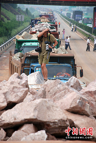 25日一早,大批满载石料的卡车沿福银高速排起长龙,等候进入堤坝卸货封堵决口。刘占昆 摄