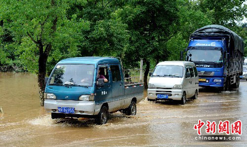 6月25日,福建建阳市境内一路段多处严重积水,过往车辆行驶难。中新社发 刘可耕 摄