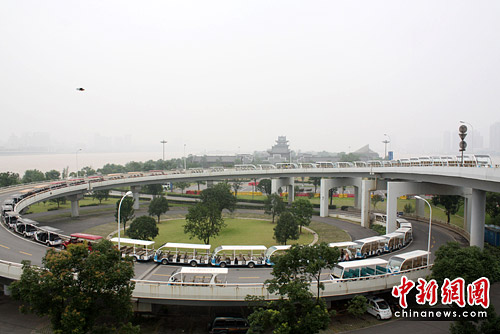从24日下午3时起橘子洲景区已全面闭园。园内电动游览车均转移至通往橘子洲大桥的引桥上,以躲避洪峰。刘柱 摄