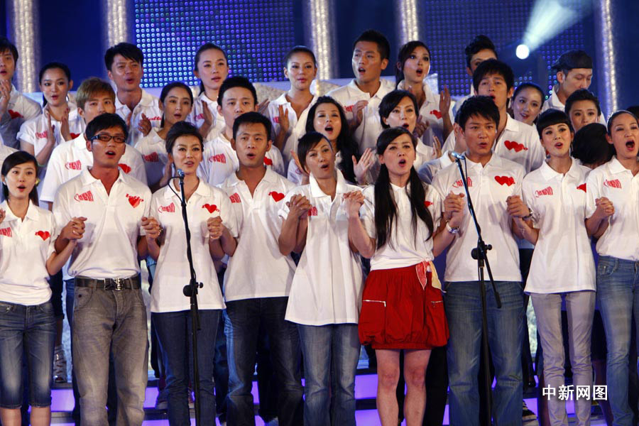 “跨越海峡的爱心”——大陆同胞援助台湾“莫拉克”台风受灾同胞赈灾晚会在北京举行,众多文体界明星在现场亮相。中新社发 杜洋 摄