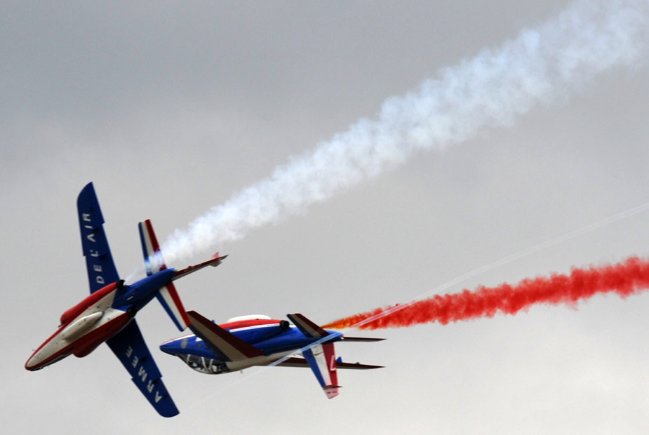8月21日,在俄罗斯茹科夫斯基市举行的第九届国际航空航天展览会上,法国著名的“法兰西巡逻兵”飞行表演队进行了精彩的飞行表演。