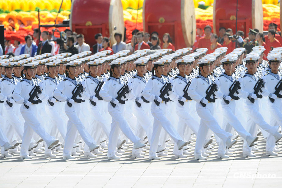 首都各界庆祝中华人民共和国成立60周年大会在北京举行。这是水兵方队通过天安门广场。中新社发 廖攀 摄
