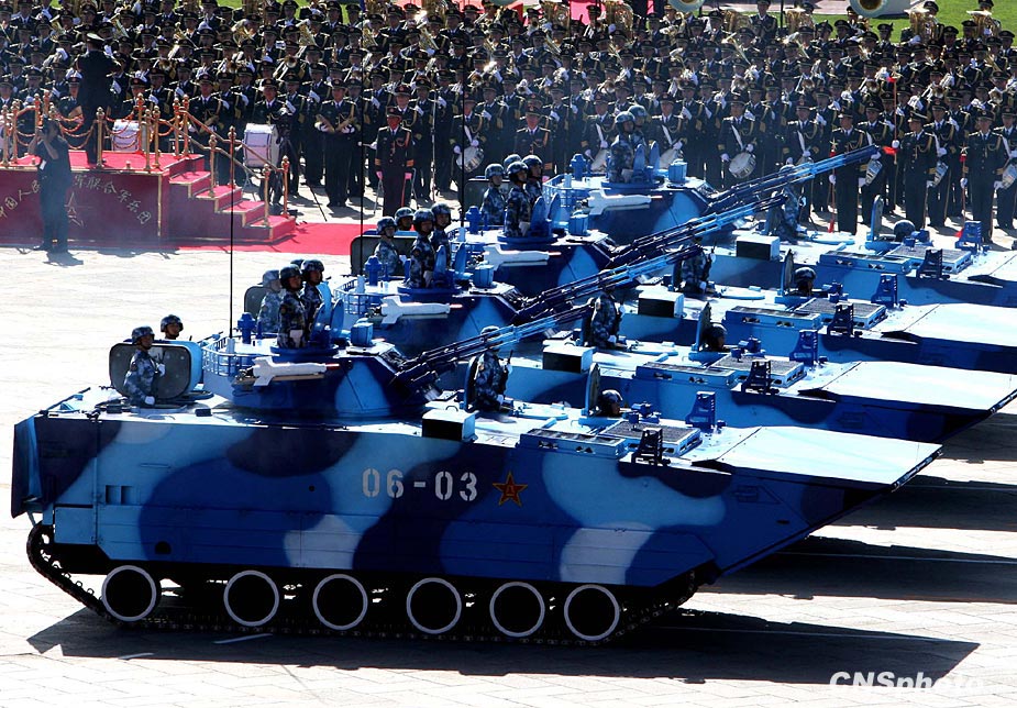 10月1日,中华人民共和国成立60周年庆祝大会在北京天安门地区及长安街沿线举行。图为海军05式两栖步战车方队通过天安门广场。首次亮相的05式两栖步战车是海军陆战队新一代主战装备,信息化程度较高,安装了先进的火控系统、卫星定位系统、夜视系统、一体化通讯系统等。同时,步战车火力系统得到全面提升,装备了反坦克导弹、速射炮和高射机枪,能有效应对来自坦克和直升机的威胁。中新社发 任晨鸣 摄