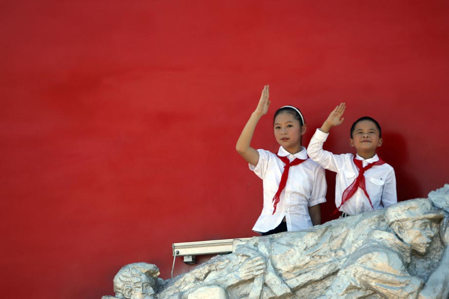 2009年10月1日,首都各界庆祝中华人民共和国成立60周年大会在北京举行。图为抗震小英雄林浩在群众游行的彩车上。
