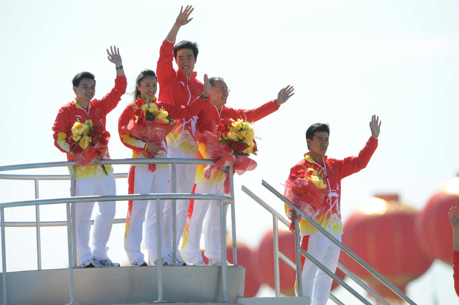 10月1日,首都各界庆祝中华人民共和国成立60周年大会在北京举行。图为刘翔、李宁等体育明星出现在彩车上。中新社发 廖攀 摄
