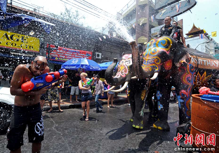 4月12日,泰国迎来一年一度的泼水节,在拷桑路旅游区人们用水枪与大象“互喷”希望为对方送上祝福同时庆祝泰国新年。图片来源:中国新闻网