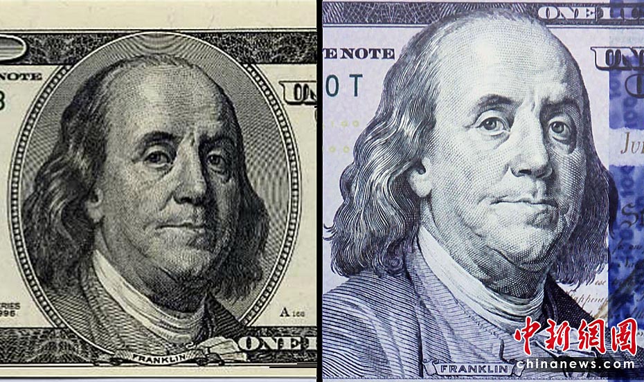 4月21日,美国财政部和美联储共同发布新版100美元面值的纸币票样。此次发行新版百元美钞旨在防范假钞,同时,老版美元仍将继续流通。图片来源:中国新闻网
