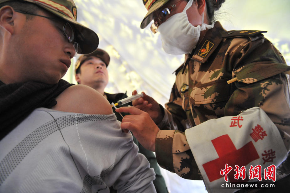 武警青海总队医院救护队半夜为受伤的士兵补打疫苗。4月下旬的玉树地震灾区急缺防疫药品,中新社发 贾国荣 摄