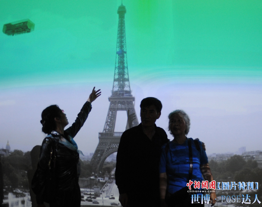 逛世博一定会拍照留念,摆一个漂亮有创意的pose尤为重要。面对着镜头,挺胸收腹翘臀,一个微笑,一个手势,秀出自己的活力。心中一定要默念:“我留下的不是照片,是心情!”图为中国游客摆出高难度pose,想和法国馆的“埃菲尔铁塔”比高。中新社发 廖攀 摄