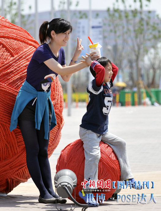 逛世博一定会拍照留念,摆一个漂亮有创意的pose尤为重要。面对着镜头,挺胸收腹翘臀,一个微笑,一个手势,秀出自己的活力。心中一定要默念:“我留下的不是照片,是心情!”图为一对母子摆出的爱心pose。中新网记者 王红纲 摄