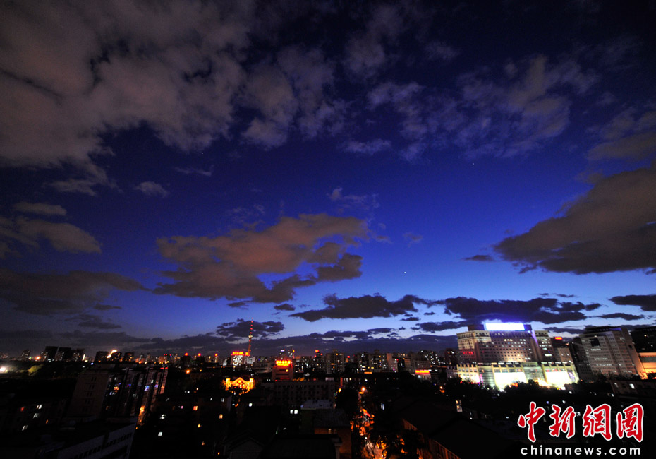 5月5日立夏,京城降雨今晨刚刚结束,雾气伺机又起。傍晚时分,随着四级北风的到来,京城天气逐渐转晴,雾气慢慢消散天空彤云密布夜色瑰丽。中新网记者 金硕 摄