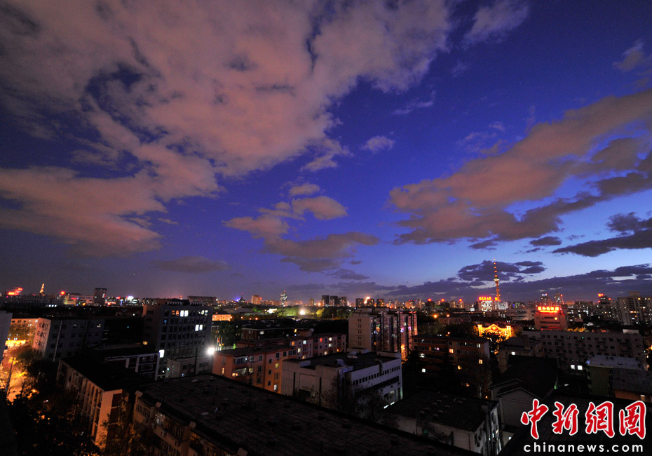 5月5日立夏,京城降雨今晨刚刚结束,雾气伺机又起。傍晚时分,随着四级北风的到来,京城天气逐渐转晴,雾气慢慢消散天空彤云密布夜色瑰丽。中新网记者 金硕 摄