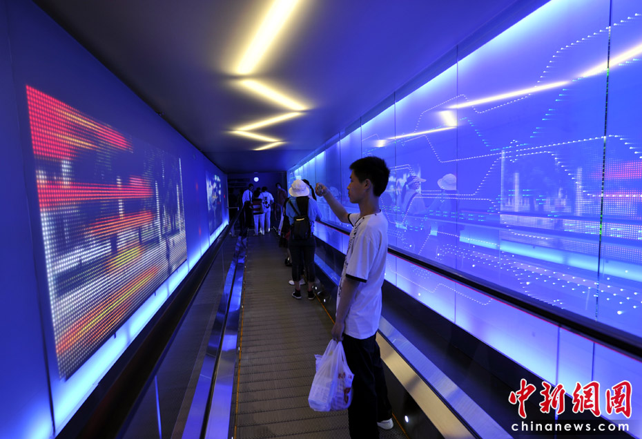 进入互动区的滚梯两侧是炫丽的屏幕,头顶上方还不时滑过一道道“闪电”。中新网记者 王红纲 摄