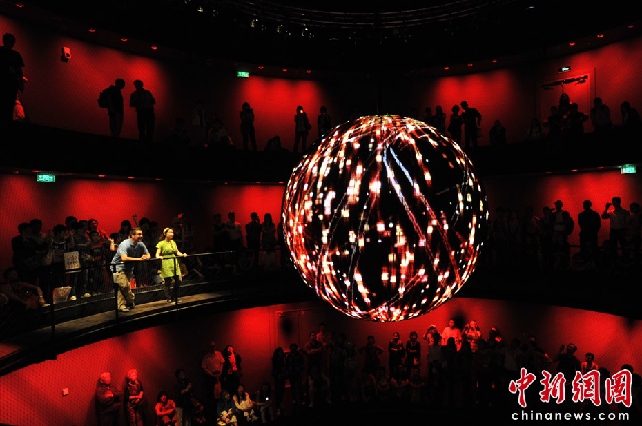德国馆的高潮就是它的最后部分“动力之源”。可以容纳600人的动力之源大厅圆形环廊是一个圆锥形空间,中间悬挂着一个重达1.5吨、直径达3米的巨大金属球,四周则有一圈供游客驻足的走廊。黑漆漆的大厅里,两个虚拟主持人邀请观众同时大声呐喊。随着呐喊声的加大,动力球慢慢摆动起来,声音越大摆动幅度越大,甚至绕圈飞行。圆球表面40万根发光的LED管,逐渐闪现出德国人对未来城市生活的畅想画面。这是一场7分钟的互动体验。在这里观众才是主角。中新网记者 王红纲 摄