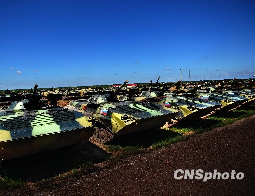 “和平使命——2009”中俄联合反恐军事演习将于7月26日进入高潮,目前中俄参加演习主战装备以良好的状态严阵以待,这些即将驰骋疆场的金戈铁马,暂时融入了大草原的寂静。参加演习的俄方陆战主战装备包括T-80坦克、步战车、152自行榴弹炮、“箭-10”防空导弹等。中新社发 宋吉河 摄