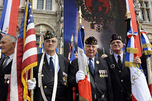 8月25日,法国在巴黎市政厅门前举行仪式庆祝巴黎解放65周年。1944年8月25日,在盟军的强大攻势下,德国驻巴黎的军队被迫投降。法国共产党领导人民起义,戴高乐将军进入巴黎接管政权,巴黎解放。图为二战老兵参加庆祝活动。