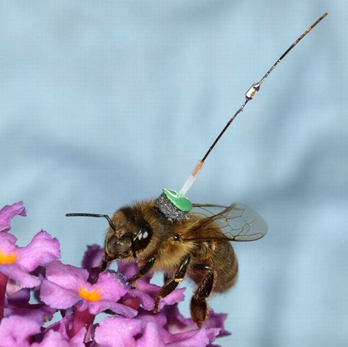 生物技术和生物科学研究中心拍摄的一张照片,一只蜜蜂背上安装了无线电身份侦测仪,可以监测蜜蜂所有的行动,以及研究杀虫剂是否可以导致昆虫大脑系统失控。