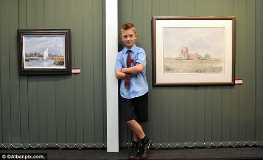 吉尔隆今年九岁,生性活泼,墙上挂的是他的12幅作品,才十分钟就销售一空,共卖出106,000英镑的惊人价格。