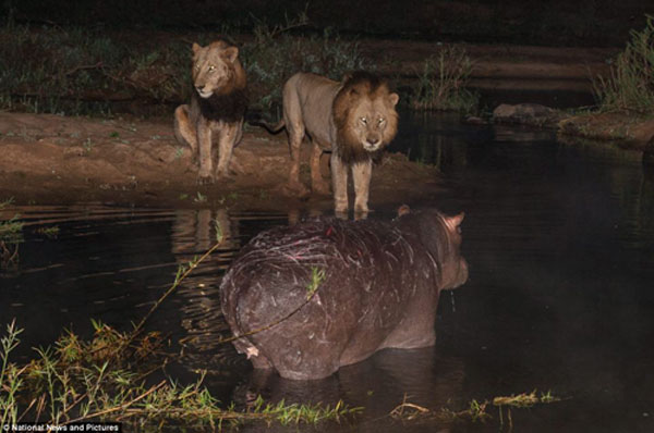 大概又过了两小时后,河马看没有任何动静,就悄悄地走出水谭。两头狮子并没有立刻对河马发起袭击,而是等河马离开水谭50米的时候才开始追捕它。一头狮子跳到了河马的背上,另外一头狮子则有机会控制河马,它们把河马拖拽到水中,将其翻转,等它一动不动了,它们就开始享用丰盛的大餐。