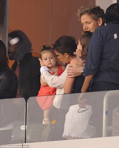 当天,小哈珀身穿一件红色胸前带蝴蝶结的小裙子,显得十分可爱。比赛期间,小公主不时站起来举起双手为父亲加油。在比赛期间贝嫂一直在玩女儿的头发,最终给自己的小公主头顶扎了一个丸子头。这足以见得贝嫂对女儿的喜爱。