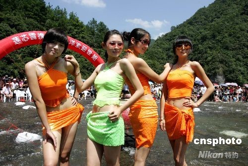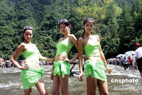 八月十八日,在首届“白水洋杯”世界小姐中国区福建赛事厦门落幕后,第58届世界小姐中国赛区亚军蒋欣妍和福建赛区众佳丽,来到白水洋景区进行了水上走秀、才艺展示等表演,并与游客们一起做水上文体游戏。中新社发 杨婀娜 摄
