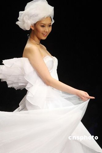 11月7日,“名瑞杯”2008中国婚纱设计大赛在北京中国国际时装周上举行,共有来自中国14个地区的25份稿件入围了最后的决赛。参赛作品类型设计多样化,有颜色和造型都很独特的礼服,也有哥特式风格的新娘装等,作品设计大胆新颖,使用夸张的造型,同时运用以点堆积成面的装饰手法,在裙身上做出图案或者肌理,来丰富服装的整体内容。现在的婚纱已经不是婚礼的附属品,而是慢慢的成为时尚亮点,新娘通过选择婚纱来体现自己的个性和心情,婚纱成为一种特殊的媒介。图为模特展示婚纱设计大赛作品。中新社发 钱兴强 摄