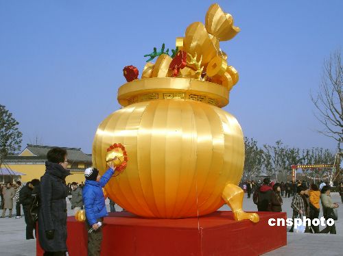 2月9日,游人在观赏巨型香炉灯。春节期间,一只寓意祈求平安的巨型香炉灯亮相姑苏名刹重元寺,成为该寺一大景观,吸引了众多游人的目光。中新社发 王建康 摄