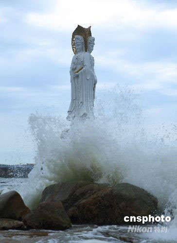 2008年9月24日下午,受强台风“黑格比”影响,海南三亚市南山风景区海滩惊涛拍岸,从掀起的巨浪前远观108米高的南海观音圣像,恰似观音踏浪归来。中新社发 宋建春 摄