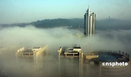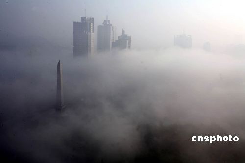 11月7日,重庆大雾,山城烟蒸雾缭,恍临仙境。11月以来,重庆连续降雨数日,当日一早天气放晴,受冷空气影响,山城出现大雾,高楼大厦云中林立,如登广寒。中新社发 秦枫 摄 < 2008-11-07 18:45:20 >