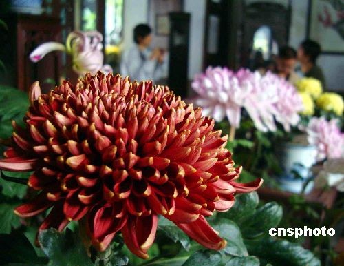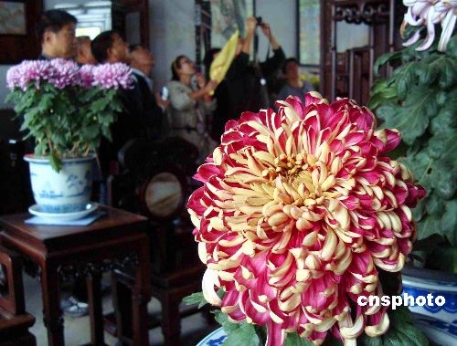 2008年11月6日,游客在苏州狮子林观赏菊花。正在苏州古典园林狮子林举办的“2008苏州园林系统菊花评比展”上,5000余盆千姿百态的菊花争奇斗艳,令众多中外游人陶醉其中,流连忘返。中新社发 王建康 摄