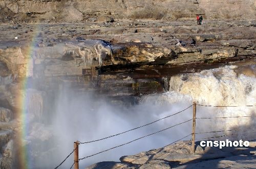 图:黄河壶口瀑布出现彩虹冰挂美景