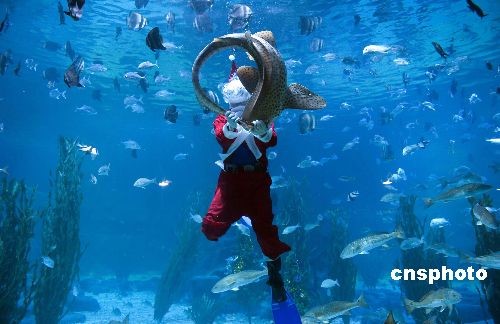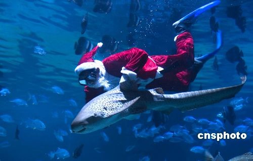 12月24日,圣诞节来临,“圣诞老人”在杭州极地海洋公园与海洋动物共度圣诞,不骑麋鹿改骑鱼。中新社发 王磊 摄