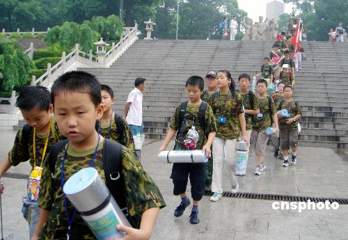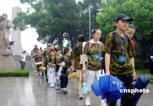 7月21日,江苏省镇江市一批身穿迷彩服的中小学生带着营帐、背包等简易生活用品,每人负重10公斤,在镇江烈士陵园庄严宣誓后出发。当日,镇江市关工委李家山社区教育中心组织开展了纪念长征胜利70周年“社区青少年,重走长征路”模拟长征行红色之旅活动,来自该市各社区的50名中小学生冒雨徒步重走长征路,途经驻镇某部、韦岗战斗纪念碑等,行程22公里,让孩子们追寻革命先辈的足迹,亲身体验红军长征的艰辛,从实践中增强团队合作精神、历史责任感和爱国爱乡之情。中新社发 石玉成 摄