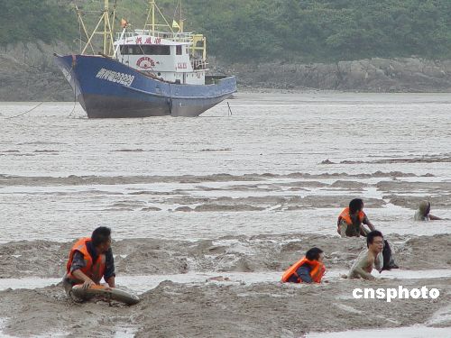 8月10日,浙江省温岭市一艘失去动力的渔船龙无法驶入避风港内避台,随着第八号超强台风“桑美”步步逼近,船上的五位渔民无法上岸,生命危在旦夕,船长向当地边防派出所发出求救信号。随后政府组织港监、边防、公安等相关职能部门展开施救,通过一个多小时的求援,赶在台风登陆前将遇险的五位渔民救上岸。中新社发 汤永祥. 摄