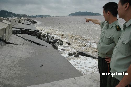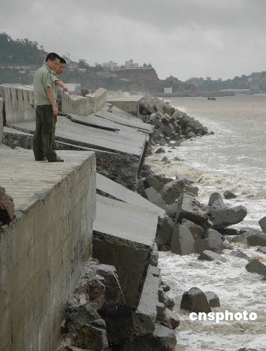 8月11日,浙江省玉环县边防官兵在坍塌的防洪堤坝周围巡逻。10日,超强台风“桑美”在浙江苍南县登陆,中心最大风力17级,受其影响,浙江玉环县坎门港内的防洪堤坝中部80余米被台风卷起的巨浪拍断。每次台风来临期间,坎门港内都有近千艘渔船在此避风,为确保下次台风来临时避风渔船的安全,目前当地有关部门正在加紧落实防洪堤坝的修复工作。中新社发 朱孝钦 摄