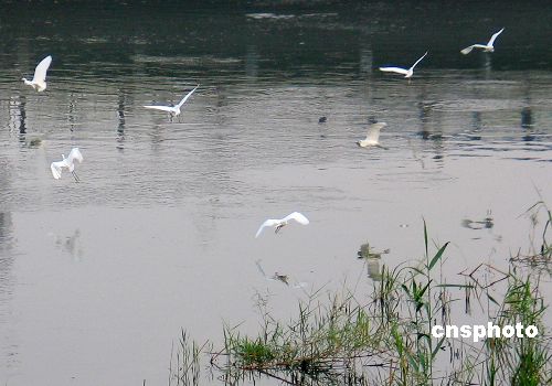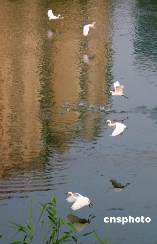 9月17日,几只鹭鸶在南京秦淮河的蓝天绿水间飞翔。近年来,随着南京对秦淮河水环境进行一系列的治理,南京的内外秦淮河水质明显好转,鱼儿欢游,水清岸澈的秦淮河吸引来了大批鹭鸶的身影。中新社发 钟山 摄