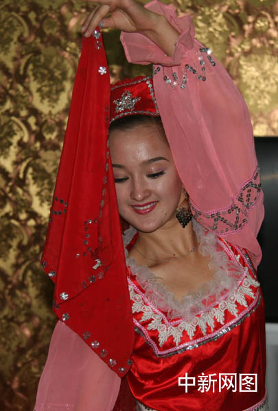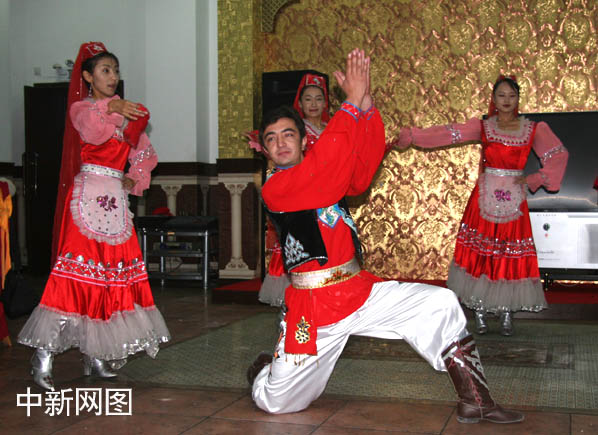 2006年9月25日,第二届中国网络媒体新疆行记者在塔城采访,当地的舞蹈演员表演了颇具民俗风情的塔塔尔族民族舞蹈。 秦欣 摄