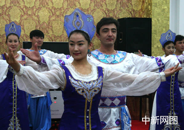 2006年9月25日,第二届中国网络媒体新疆行记者在塔城采访,当地的舞蹈演员表演了颇具民俗风情的俄罗斯族民族舞蹈。 秦欣 摄