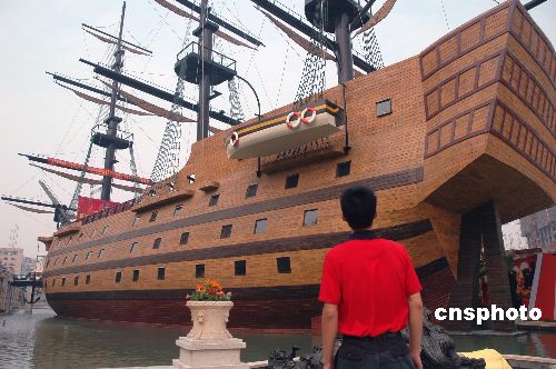 九月二十九日,江西南昌青山路一家正在新建的大型购物广场内,一艘仿英国古典帆船的出现,令一位南昌市民好奇地驻足观赏。据悉,该帆船投资八百万元人民币,是一艘三桅帆船,船长五十余米,宽十五点五米,船舱内可接待逾百名顾客。 中新社发 段长征 摄