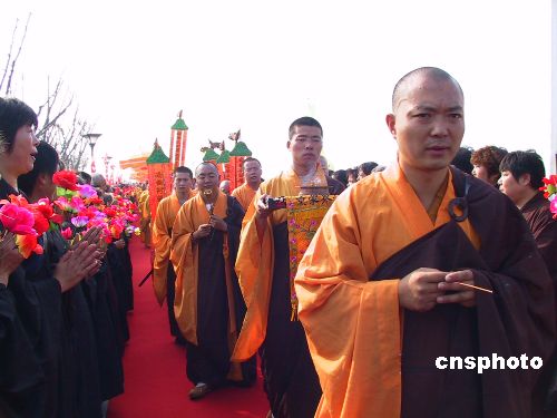 九月二十七日,“中国佛教名山聚首狼山活动”在江苏南通举办,来自山西五台、浙江普陀、四川峨眉、安徽九华四大佛教名山,陕西终南山、云南鸡足山、河南嵩山、浙江天台山、湖南衡山、江西庐山等主要国内佛教道场等人士,以及与佛教有着殊胜因缘的海内外朋友一千余人,齐聚紫琅之巅,共吟和谐梵音。图为开幕式中的迎请仪式。中新社发 朱晓颖 摄