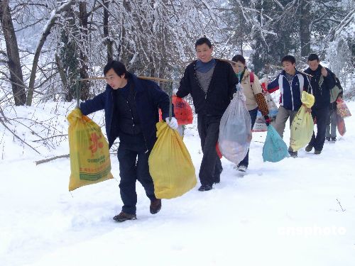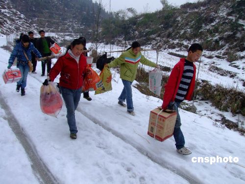 2月4日,宜春温汤谢坪村因冰雪灾害,山区道路积雪结冰无法通车,村民们冒着严寒冰冻步行十几公里到镇上采购年货,肩挑手提行走在回家的路上。元月中旬以来,江西省宜春市遭遇了几十年一遇的冰雪灾害,给山区道路交通造成严重影响,但严寒冰冷挡不住村民过年的脚步。中新社发 彭小榕 摄