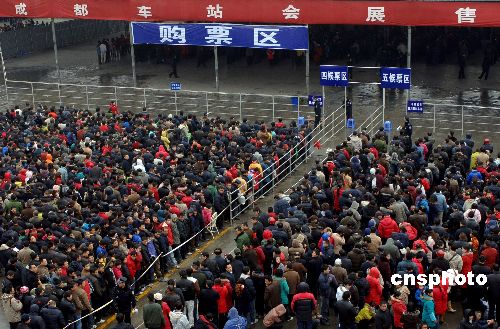 2月8日,成都站售票处排队买票的旅客。成都站在原有售票大厅、临时售票大厅和学生售票厅共62个售票窗口向出行旅客售票的基础上,从当日开始至2月28日,又在成都市沙湾会展中心增设了临时售票处,为节后出行和返程旅客出行顺利提供方便。中新社发 曹宁 摄
