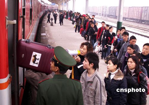 2月8日,成都铁路局福泉火车站出现节后第一次民工返程高峰。面对贵州民工流和旅游流的蜂拥而来,成都铁路局福泉火车站采取应急预案,确保民工有序购票乘车。中新社发 姜泽鹏 摄