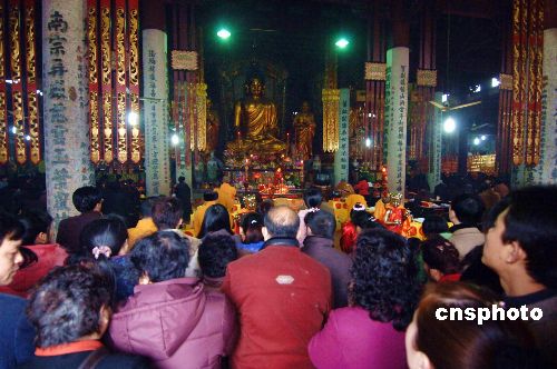 二月九日,中国农历正月初三,上万福州市民及外地游客来到西禅寺集体诵“万佛忏”,祈求在新的一年身体健康、万事如意。中新社发 王东明 摄