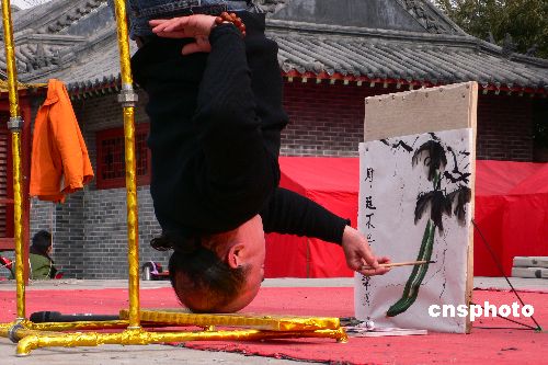 2月9日,在河南省开封市翰园碑林举办的第九届春节祭祖大庙会上,中华奇人阎玉华人体倒立作画和人体倒立在钢锥上书画绝活、绝技,让游客大开眼界。中新社发 凯枫 摄