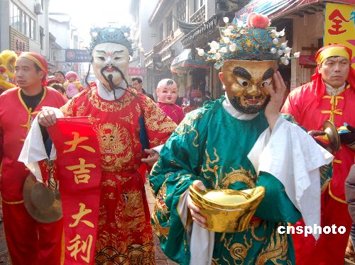 2月11日,两名扮成“财神”的演员在苏州南浩街巡游“送财”。据悉,苏州民间素有农历正月初五“迎财神”的传统,各种形式的“迎财神”民俗活动,吸引了众多市民和游客。中新社发 邱勇 摄